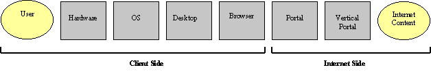 Traditionally, internet companies (including portal sites) have concentrated on the internet side of this picture. The thinking has been that while the client side provides access, the internet side is where the services are delivered. However, in reality, the internet is not as platform independent as envisioned, and the client hardware and software used can have a deciding influence on how internet services are used. At the browser level, both Netscape and Internet Explorer guide users to preferred portal sites - for example Netscape Communicator leads you to Netcenter if you press the 'Search' or 'My Netscape' buttons, or if you enter keywords in the URL field.